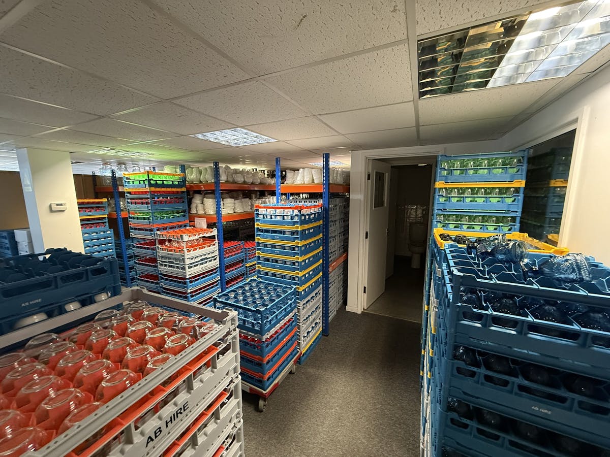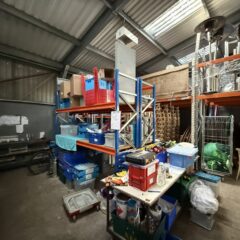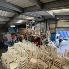 The subject property comprises a detached self-contained industrial unit of steel portal frame construction with profiled cladding and facing brick elevations. Internally, the ground floor is split into warehouse and office accommodation beneath a mezzanine floor, currently fitted for the party and catering hire tenant with racking and shelving.