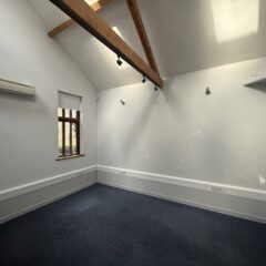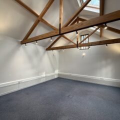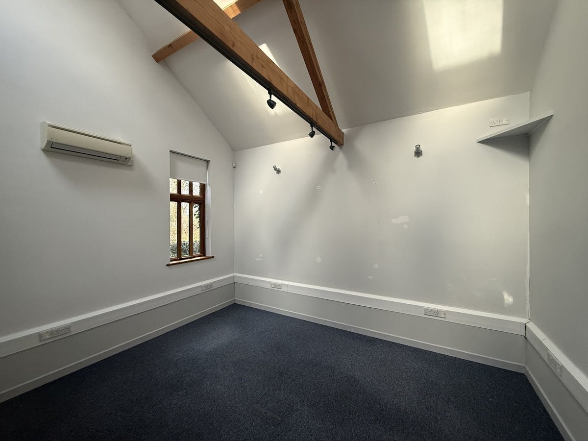 Internally, the space benefits from exposed timber trusses, rooflights, surface-mounted lighting and comfort cooling to sections. The premises further benefits from kitchen facilities and WC provision, together with convenient access to on-site parking with 9+ spaces and external amenity space.
